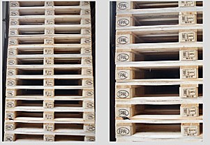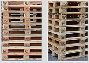 Je Seite mindestens eine EPAL-Kennzeichnung lesbar. Leichte Holzabsplitterungen zulässig. Kann repariert worden sein. Reparaturkennzeichnungs-Nagel als Nachweis für lizenzierte Reparatur.